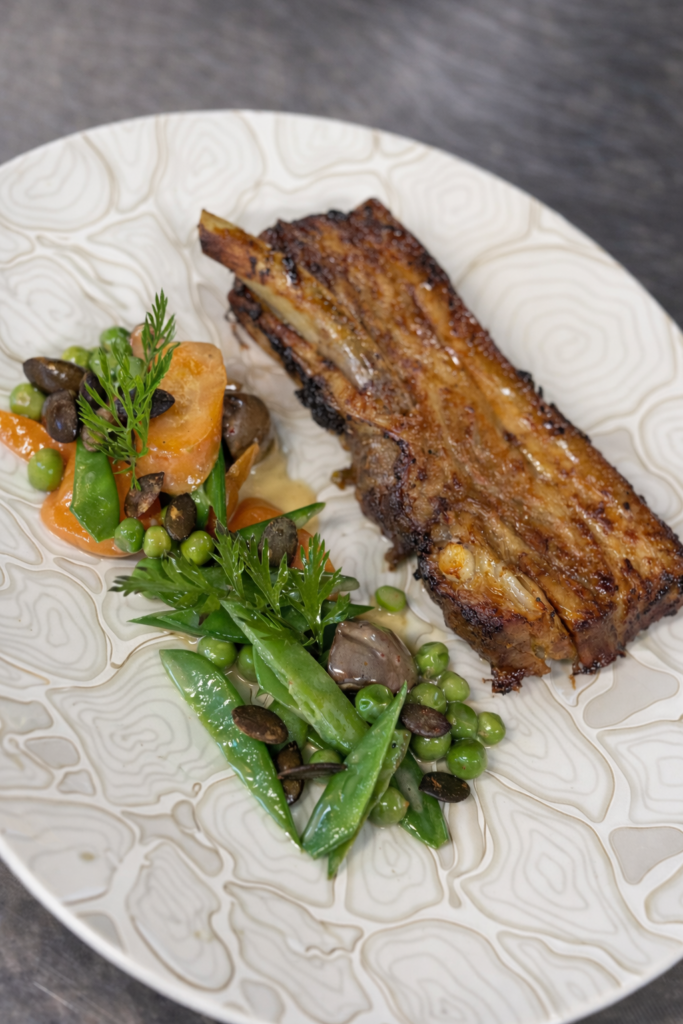 Paleron de boeuf braisé, foie gras poêlé, croustillant de pommes de terre et carottes fanes rôties, jus corsé au Chinon