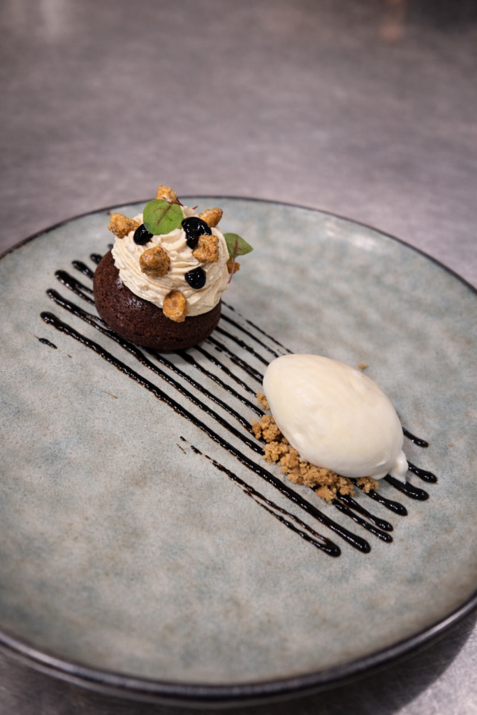 Chocolat moelleux pécan macadamia, ganache chocolat blanc et cacahuètes, glace flibustière*, coulis de caramel blond au miso blanc et sirop d’érable